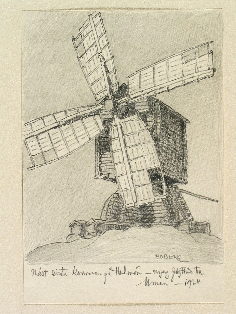 Västerbotten, Sävars sn., Holmöns kapellförsamling, Holmön. "Näst sista kvarnen på Holmön nyss flyttad till Umeå". Teckning av Ferdinand Boberg