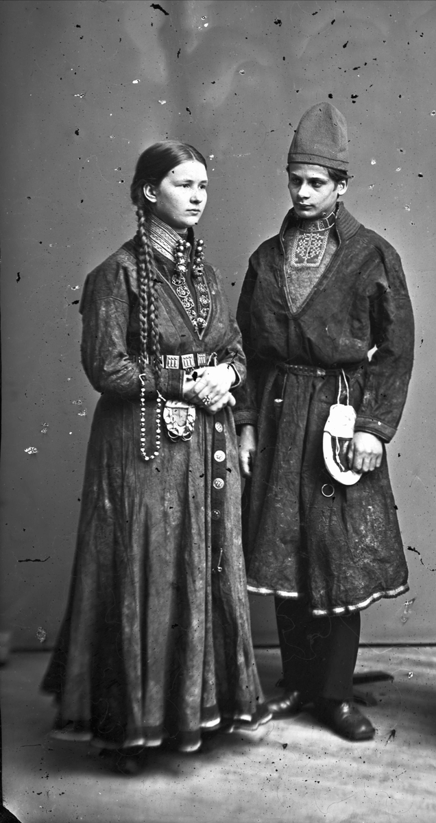 Porträttfoto i helfigur av ungt par i helgdagsdräkt. Kvinnan bär silversmycken och mannen har en halskrage med tenn- eller silverbroderi.