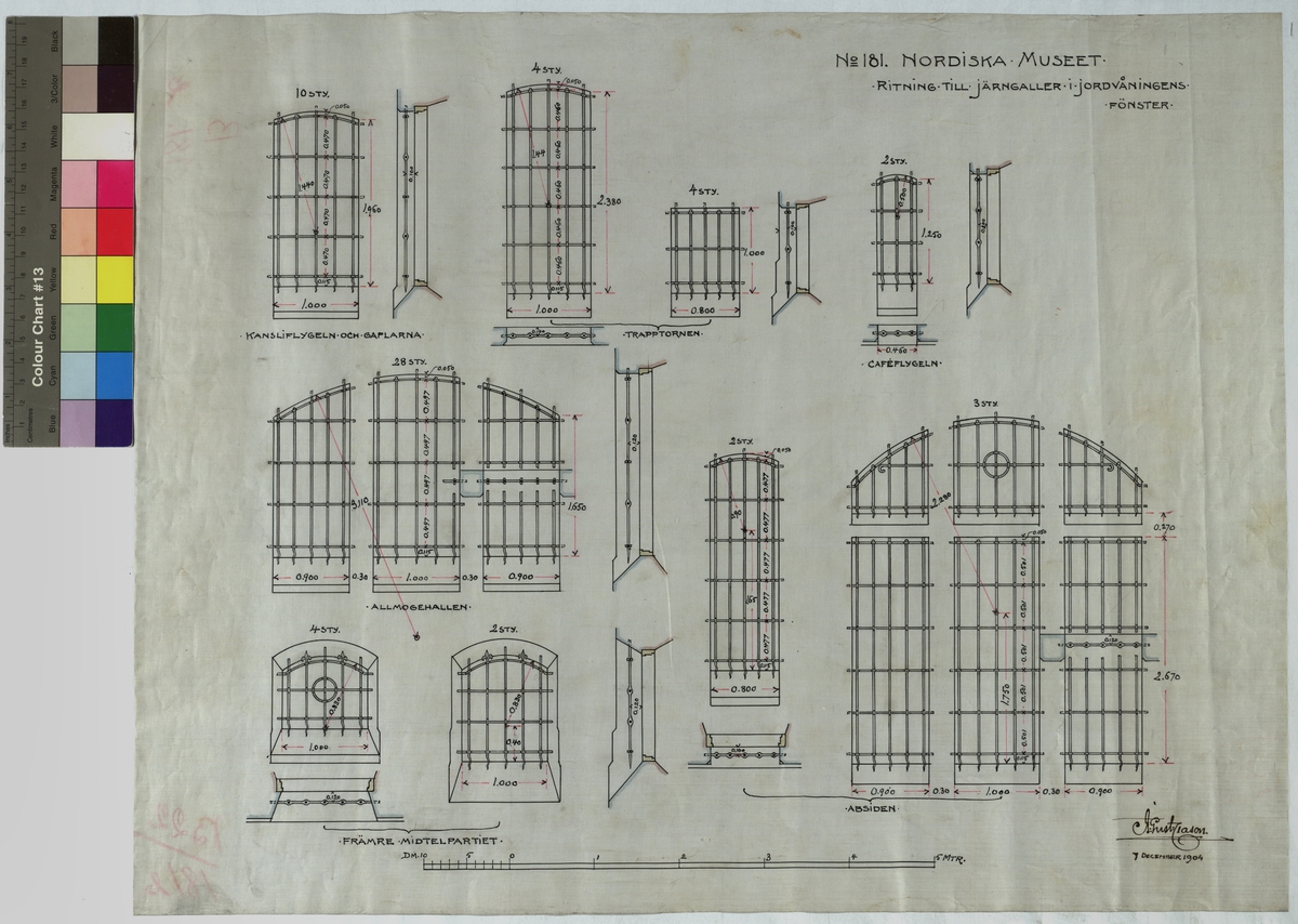 Ritning på väv över Nordiska museets huvudbyggnad. Ritning till