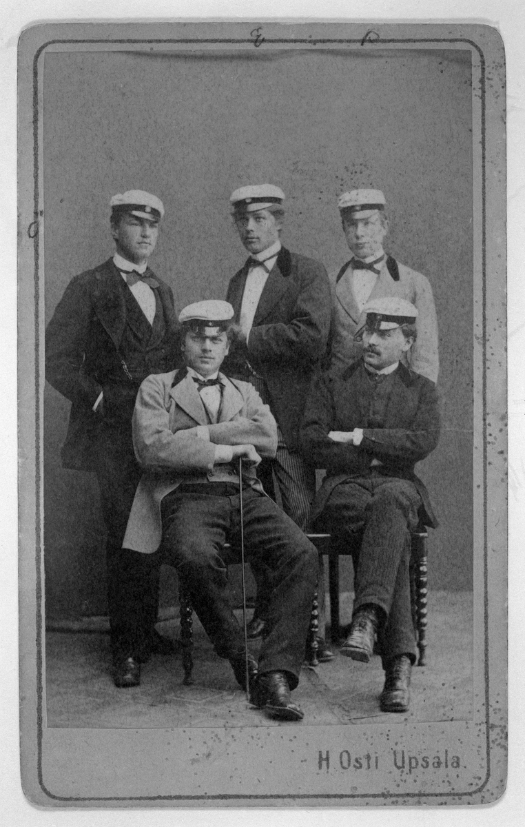 Studenter i Uppsala, våren 1874. Längst till höger sitter John Böttiger. Ateljéfotografi av Henri Osti.