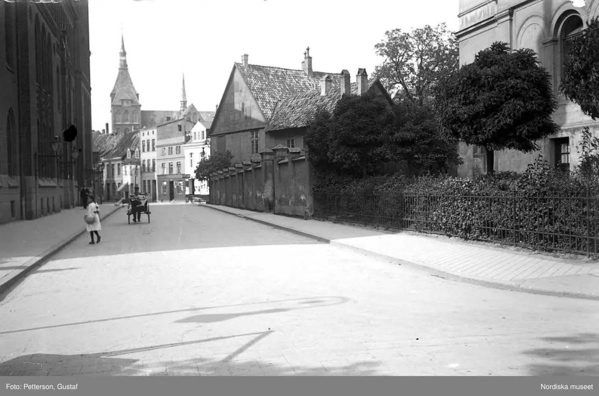 Vy från norra Tyskland, Rostock. Buchbinderstrasse ifrån fond husen, Marienkirche. Till vänster: Portamö?.