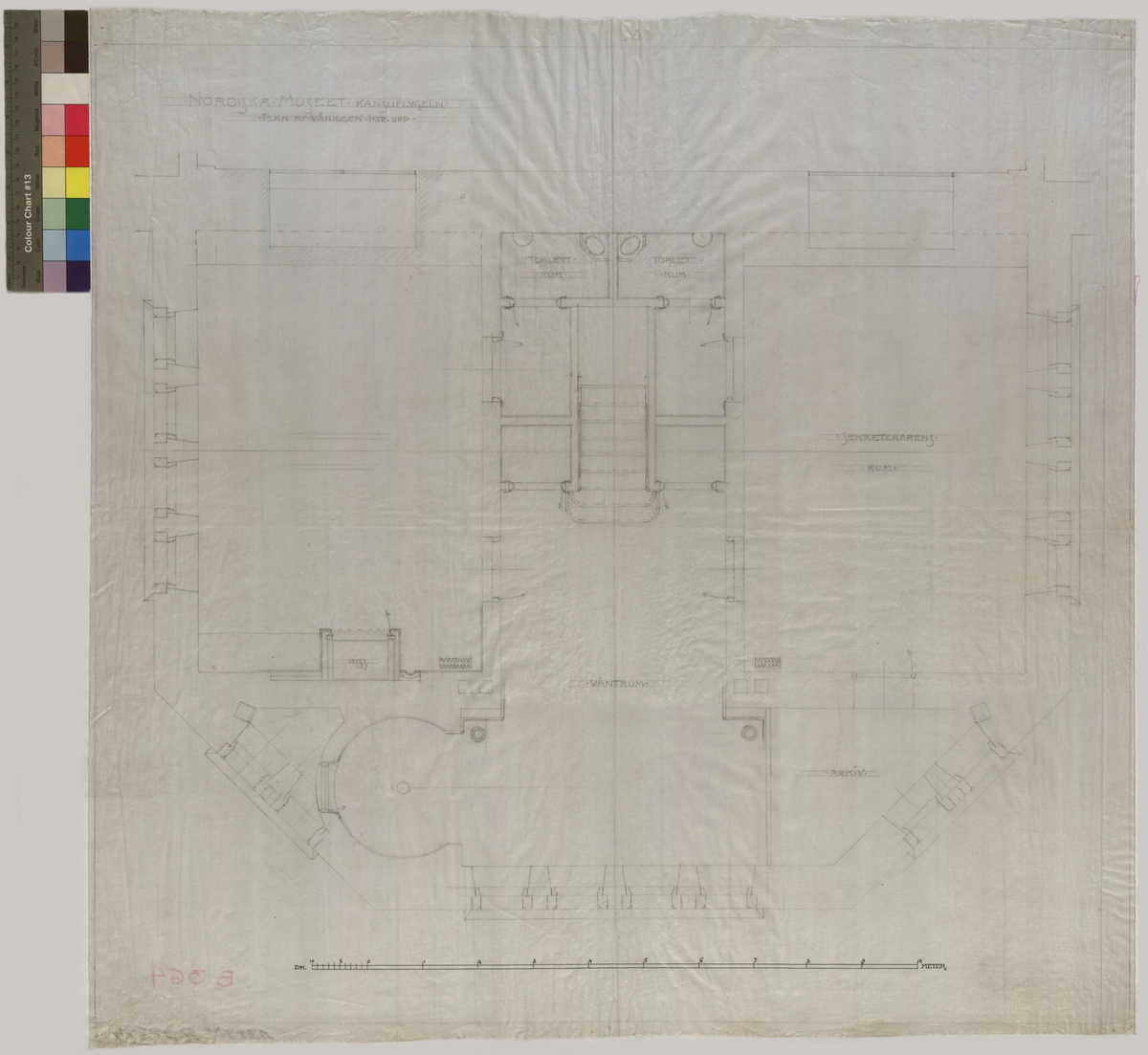 Ritning på väv över Nordiska museets huvudbyggnad. Kansliflygeln. Plan av våningen 1 trappa upp. Planritning, kanslibyggnaden. 74x76 cm. Blyerts. Linjalritning. Osignerad.