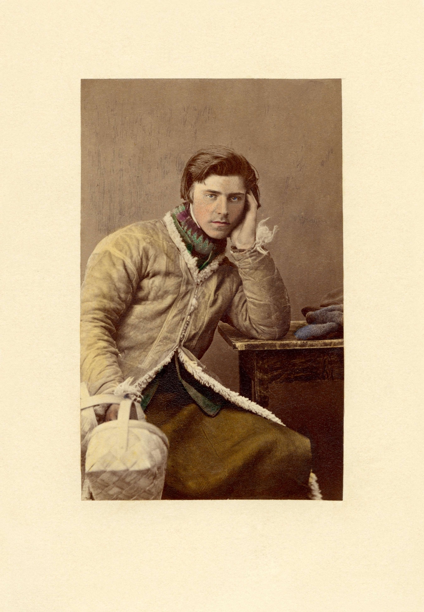 En ung man i folkdräkt från Dalarna sitter vid ett bord, lutar huvudet i handen. Vinterjacka och förkläde av skinn. Handkolorerat foto.