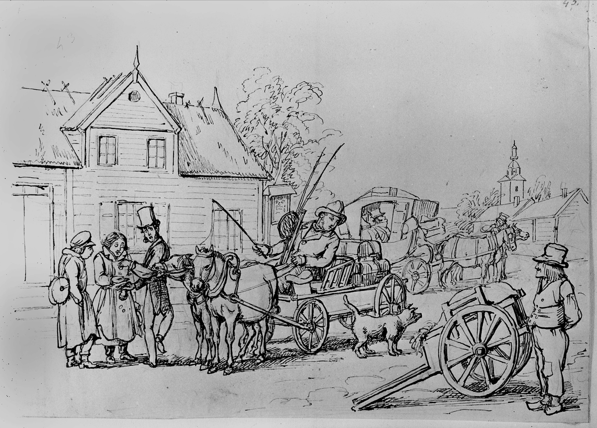 Exteriörmiljö från ett halländskt gästgiveri, till vänster: en betalande resenär. Teckning av Fr. v. Dardel (1817-1901) ur: "Mrs. Black&Smith. En route pour la Scandinavie". Handskrift.