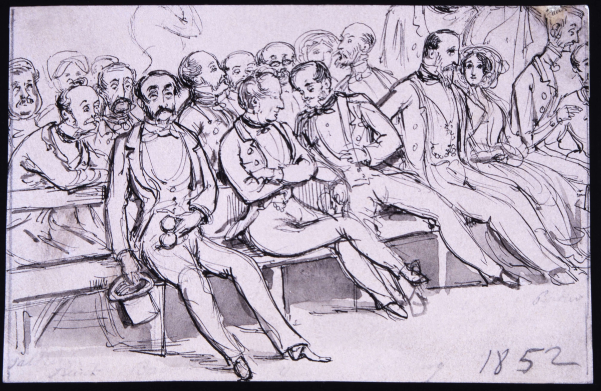 "Ett besök på Kungliga Theatern 1852". Tuschteckning av Fritz von Dardel, 1852