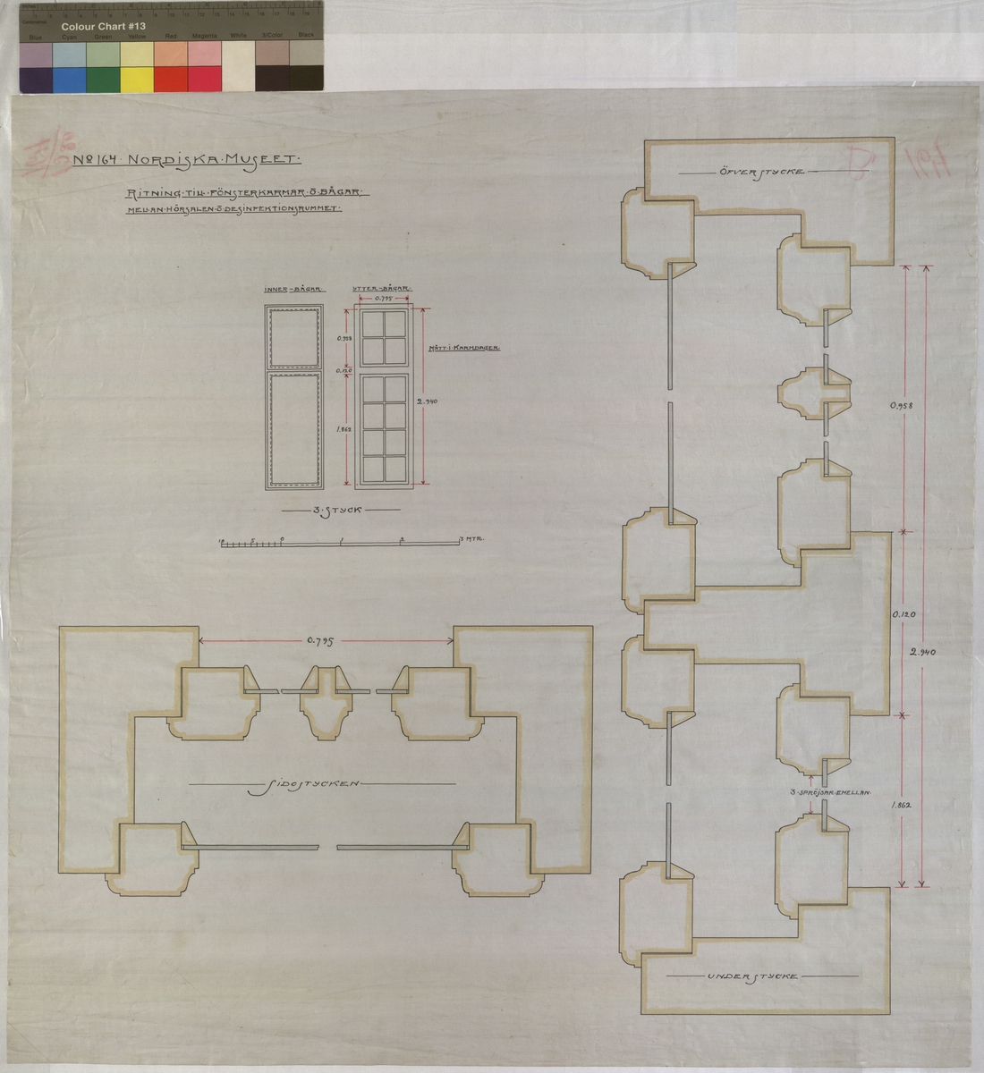 fönsterkarmar och bågar mellan hörsalen och desinfektionsrummet. Innerbågar. Ytterbågar. Konstruktion. Fönster. 65x64,5 cm. Tusch, rött, gult och grått. Linjalritning. Osignerad.