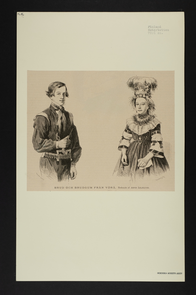 Titel: Ark med monterat bildtryck och text: "Brud och brudgum från Vårö. Tecknade af Arvid Liljelund."