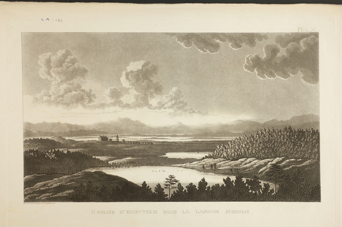 Grafiskt tryck. "L'Eglise d'Enontekis dans la Laponie Suedoise." Tecknad av A. F. Skjöldebrand. Vy över landskap med vatten, skog, bebyggelse och berg. L. A. 1841.