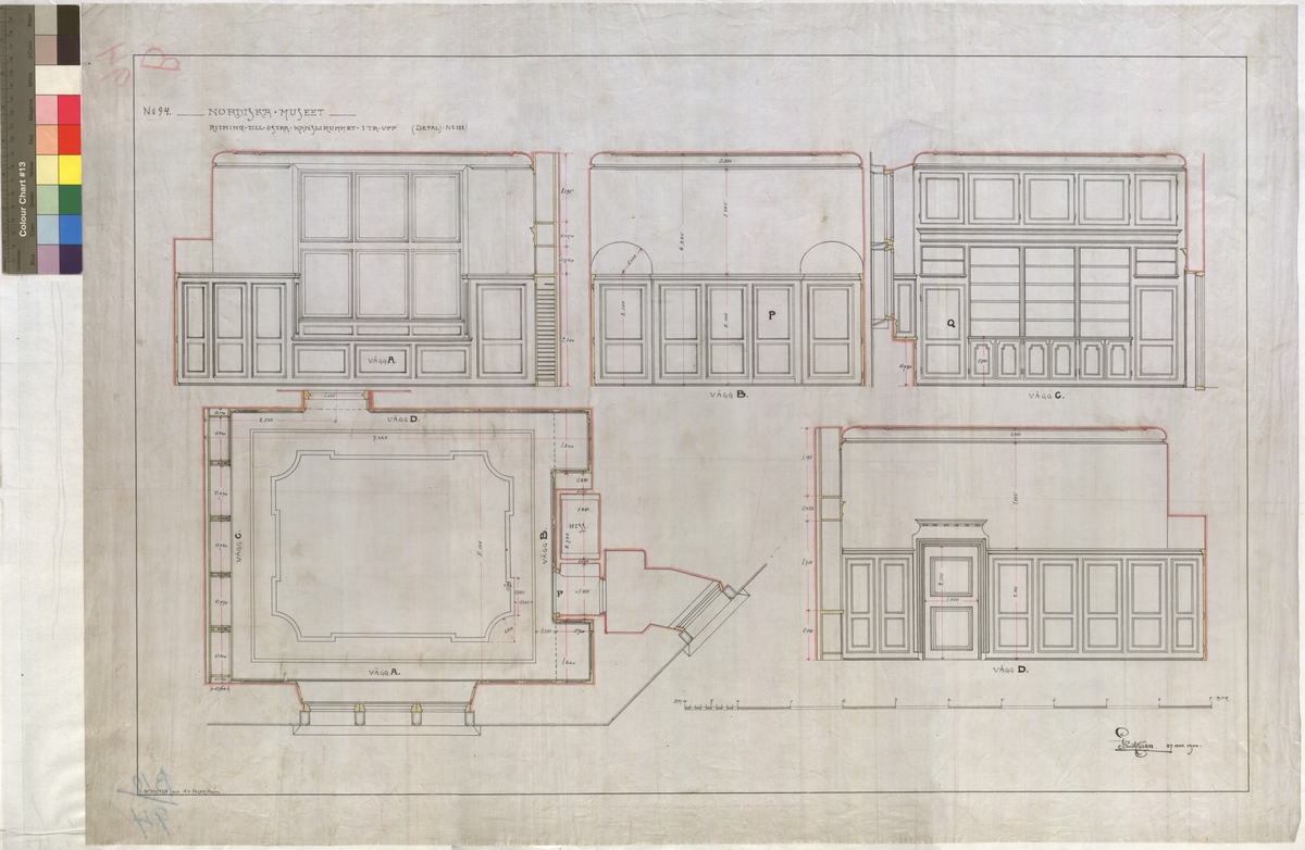 Ritning på väv över Nordiska museets huvudbyggnad. Ritning till östra kanslirummet 1 tr upp med hiss. (Detalj No 122). Plan, Sektion. Kansliet 1 tr upp, panel. 64x92 cm. Tusch, rött, gult och grått. Linjalritning. I Gust Clason 27 Oktober 1900. C Bergsten och A V Fagerström.