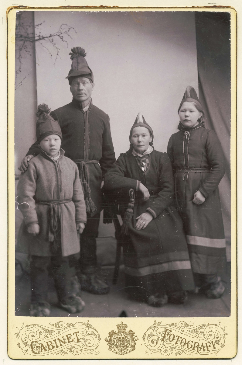 Monterat ateljéporträtt av samen Anders Mårtensson Ringdal med familj.