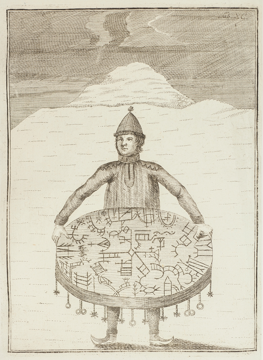 Stick ur Knud Leems bok: Beskrivelse over Finmarkens lapper, deres tungemaal, levemaade og forrige afgudsdyrkelse med J.E. Gunneri Anmaerkninger. Tab. XC. Man med cermoniell trumma.
