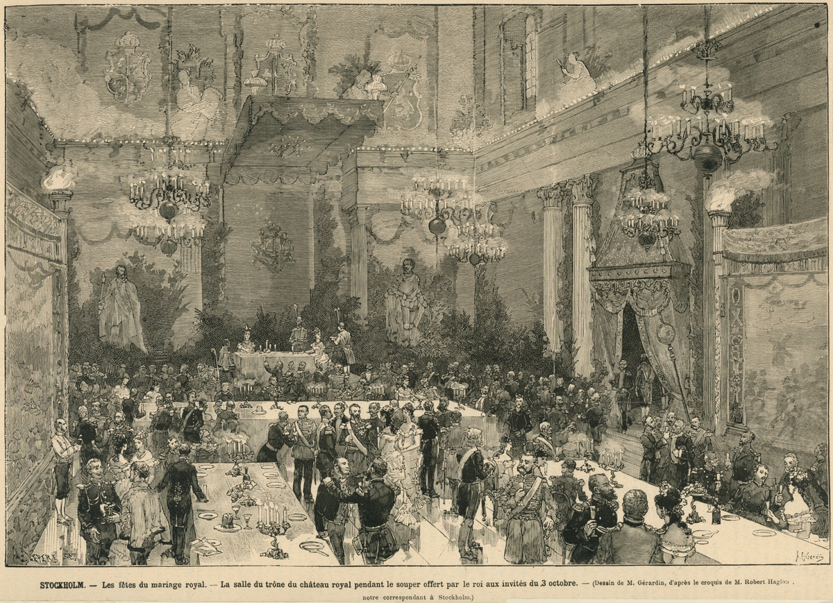 Tryck.Kronprins Gustavs och Viktorias av Baden förmälning 1881. Teckning av A. Gérardin efter R. Haglund(1844-1930) illustrerad i Le Monde 11 oktober 1881. "Stockholm- Les fétes du mariage royal - La salle du tròne du château royal pendant le souper offert per le roi aux invités du 3 octobre"