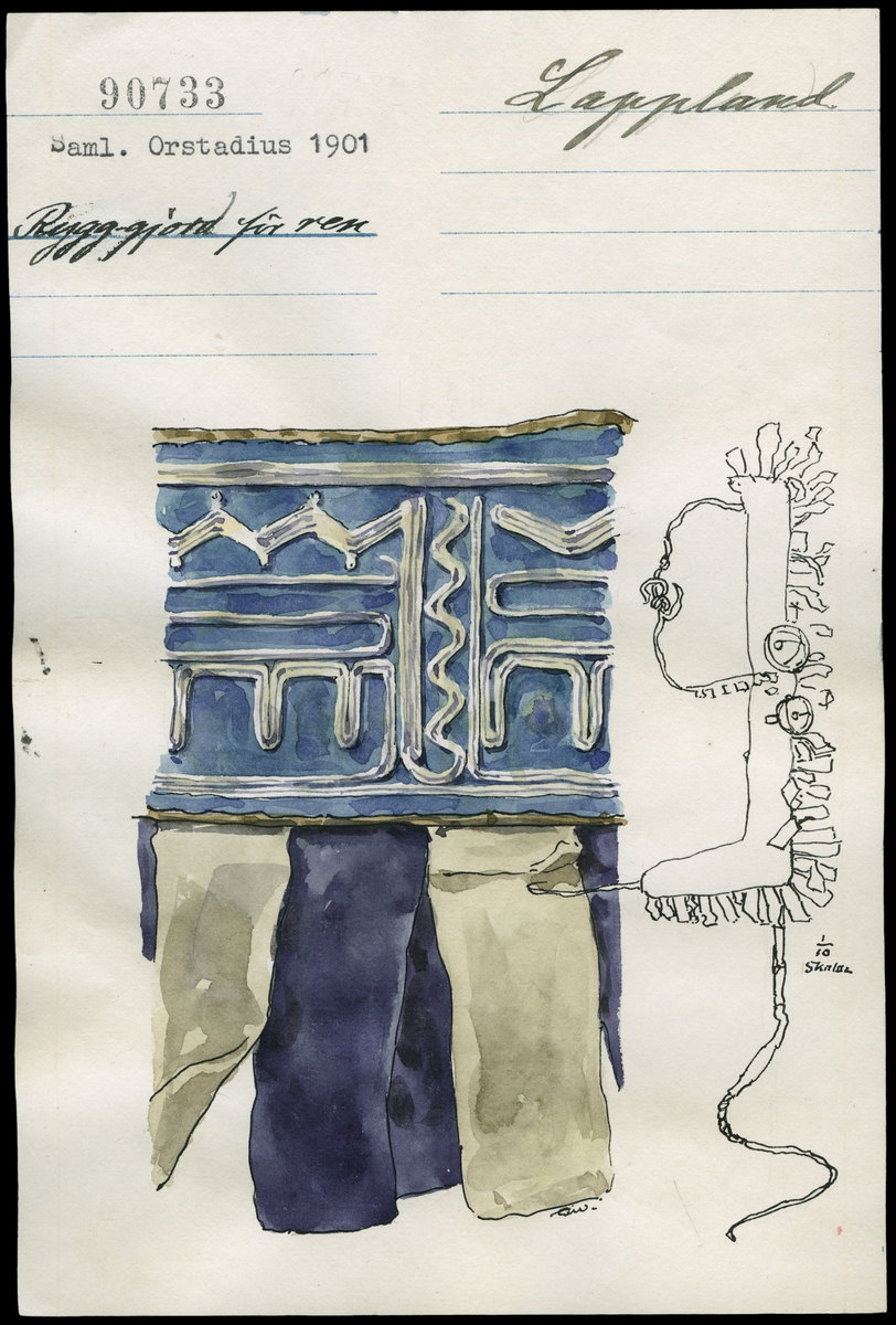 Katalogiseringskort, så kallad kataloglapp, från Nordiska museet. Föremål inv.nr NM.0090733, rensele från Lappland. Akvarellerad teckning avbildar föremålet.Teckningen gjord av Emelie von Walterstorff.