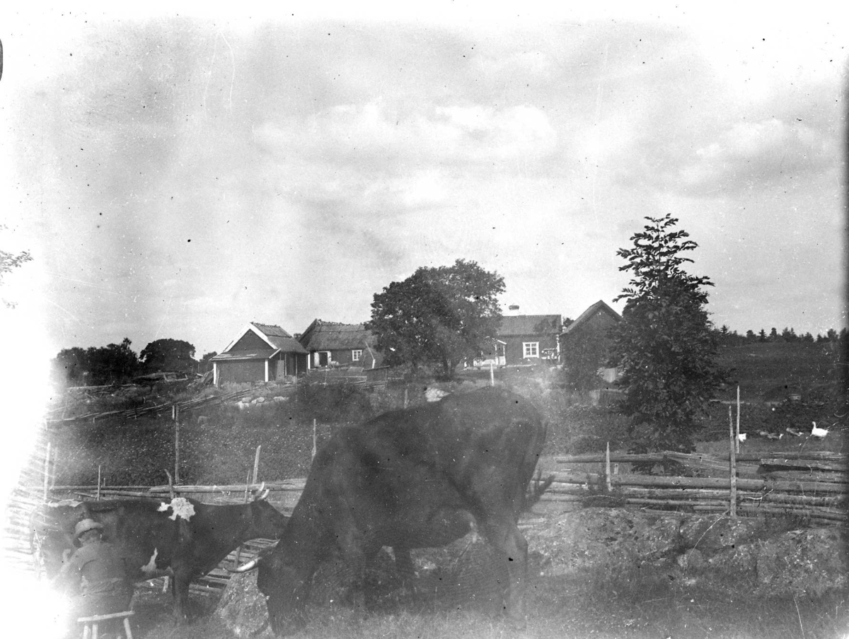 Två kor i beteslandskap. den ena mjölkas av en man, den andra betar. I bakgrunden en gärdsgård och gårdsbyggnader.
