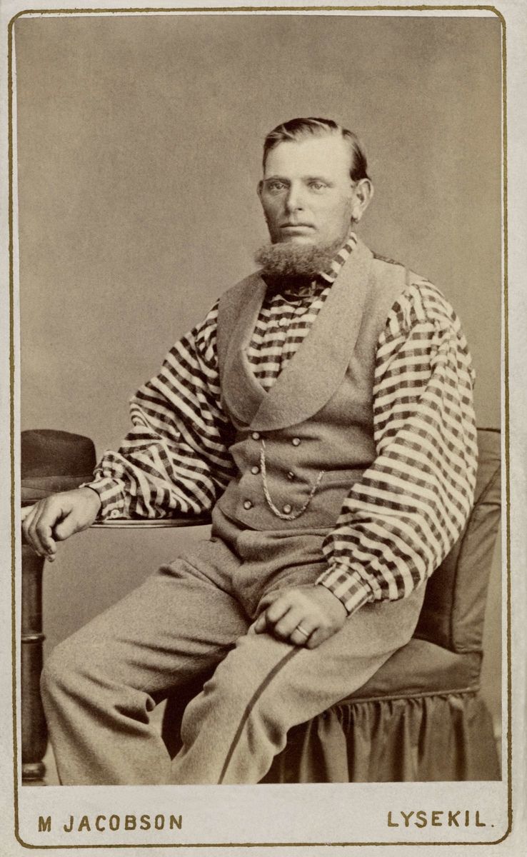 Ateljéporträtt. En man poserar i en rutig skjorta, dubbelknäppt väst, byxor med revärer
