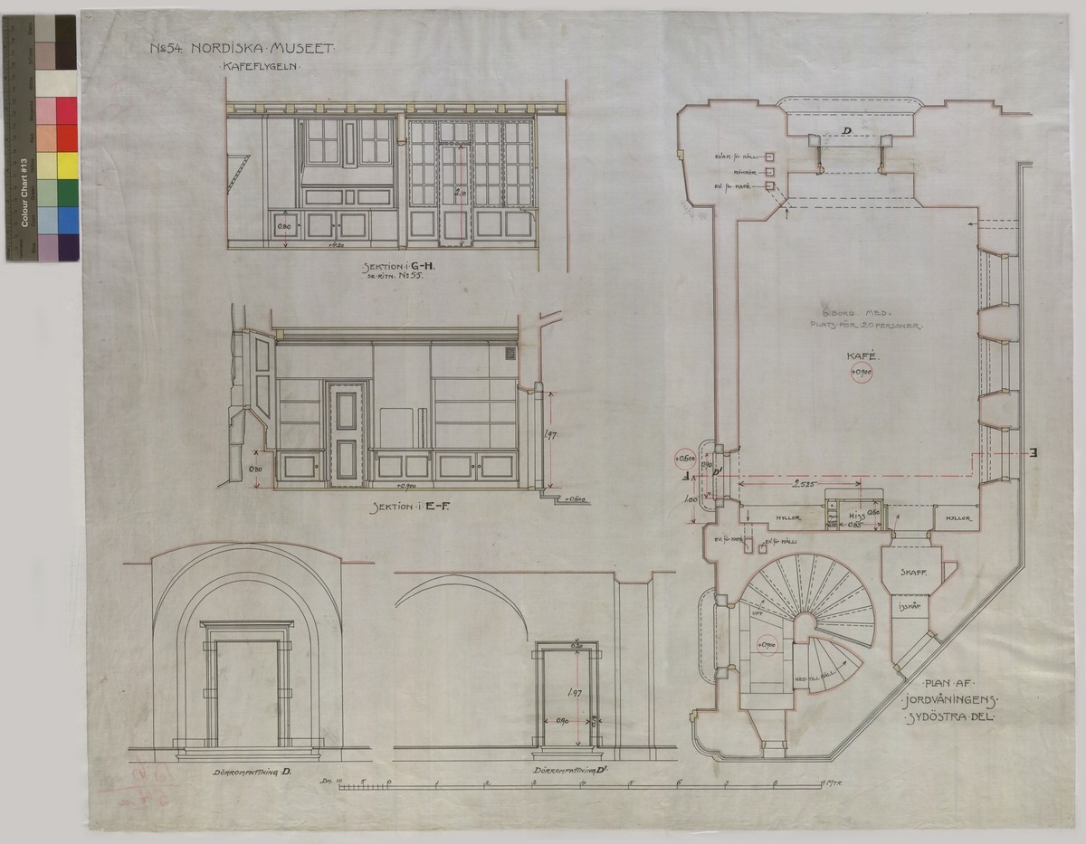 Ritning på väv över Nordiska museets huvudbyggnad. Kaféflygeln. Plan av jordvåningens sydöstra del. Plan, sektion. Jordvåningen, kafébyggnaden. 68x 82 cm. Tusch, rött, gult, grått och brunt. Linjalritning. Osignerad.