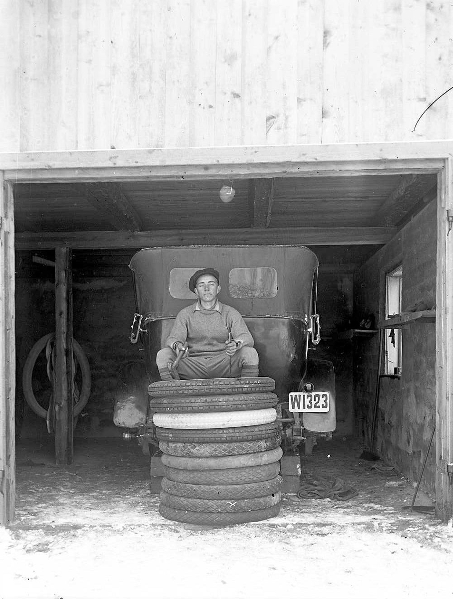 En bilmekaniker ovanpå en hög av bildäck i ett garage.