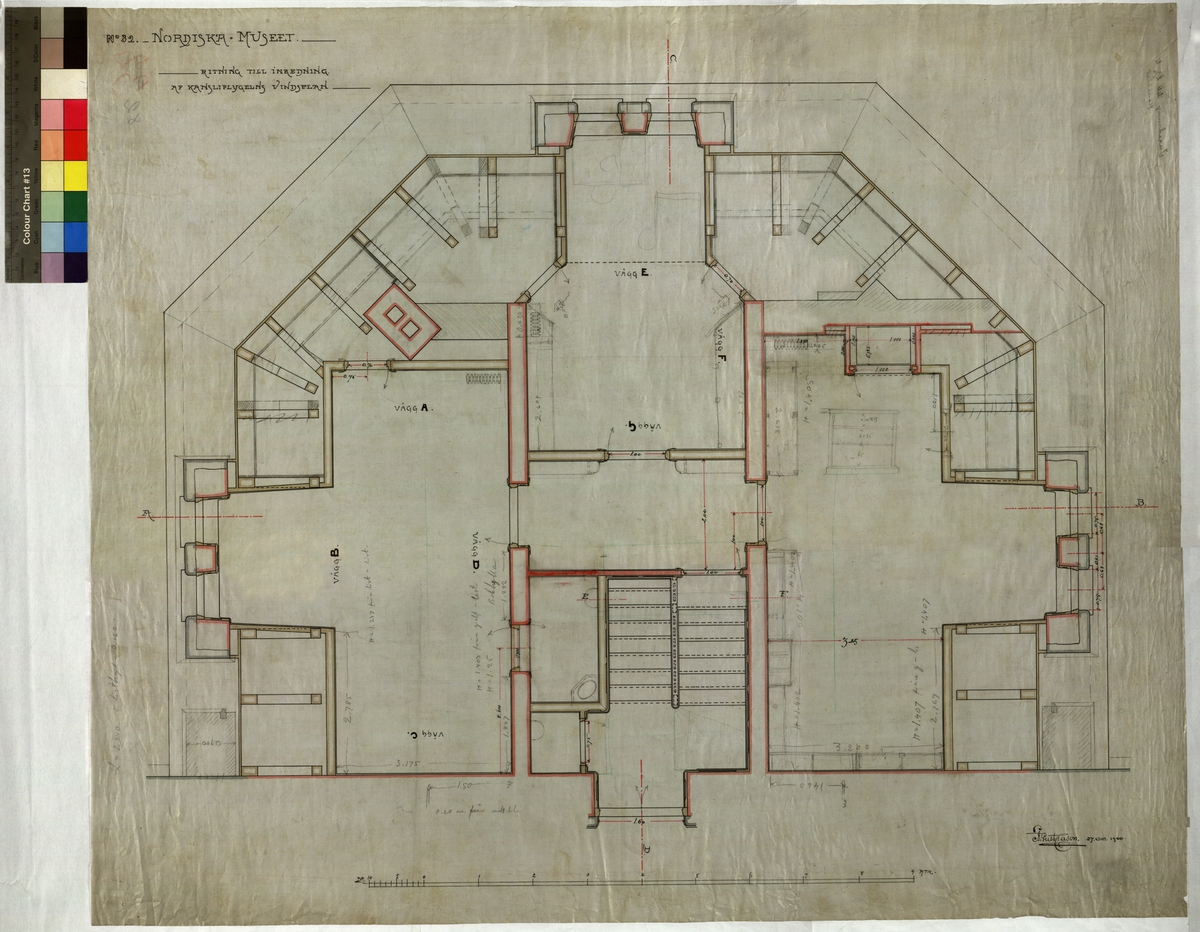 Ritning på väv över Nordiska museets huvudbyggnad. Ritning till inredning av kansliflyelns vindsplan. Plan. Kanslibyggnaden, vind. 67x80 cm. Tusch, rött, brunt och blyerts. Linjalritning. I Gust Clason 27 oktober 1900.