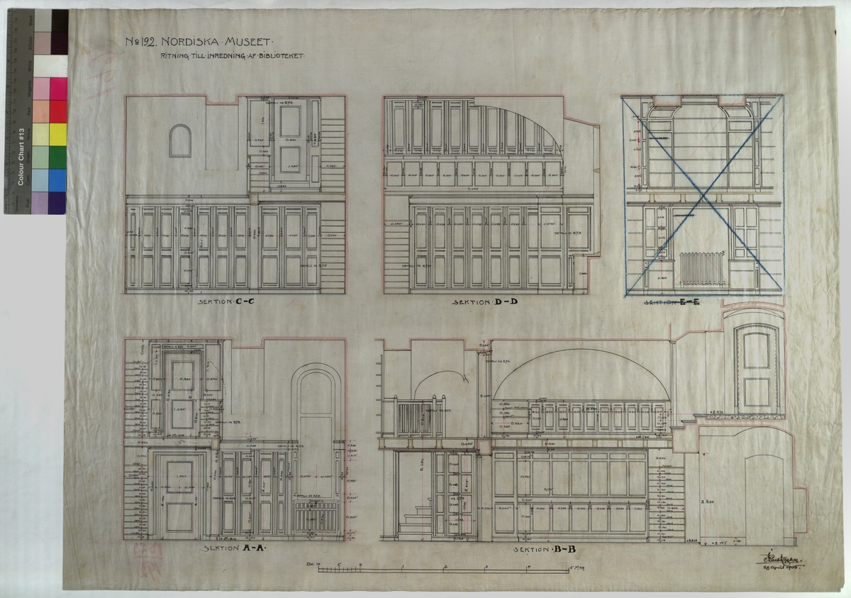 inredning av biblioteket. Fast inredning. Bibliotek, panel och hallvåning. 56,5x75 cm. Tusch, rött, gult och blått. I Gust Clason 28 april 1905.