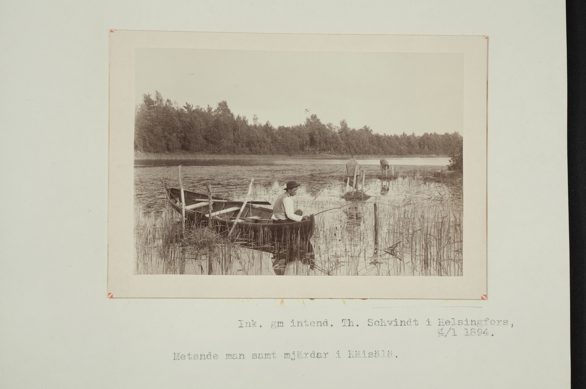 Ark med monterat foto och text: "Metande man samt mjärdar i Räisälä."