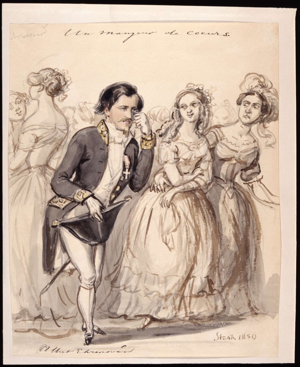 "Un mangeur de coeurs. Albert Ehrensvärd". Man med monokel bland kvinnor. Akvarell av Fritz von Dardel, 1850