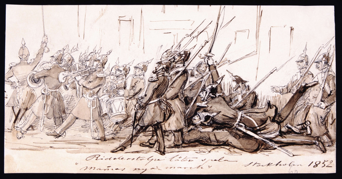 "Ridderstolpe låter spela en ny marsch." Militärer på parad. Tusch av Fritz von Dardel, 1852