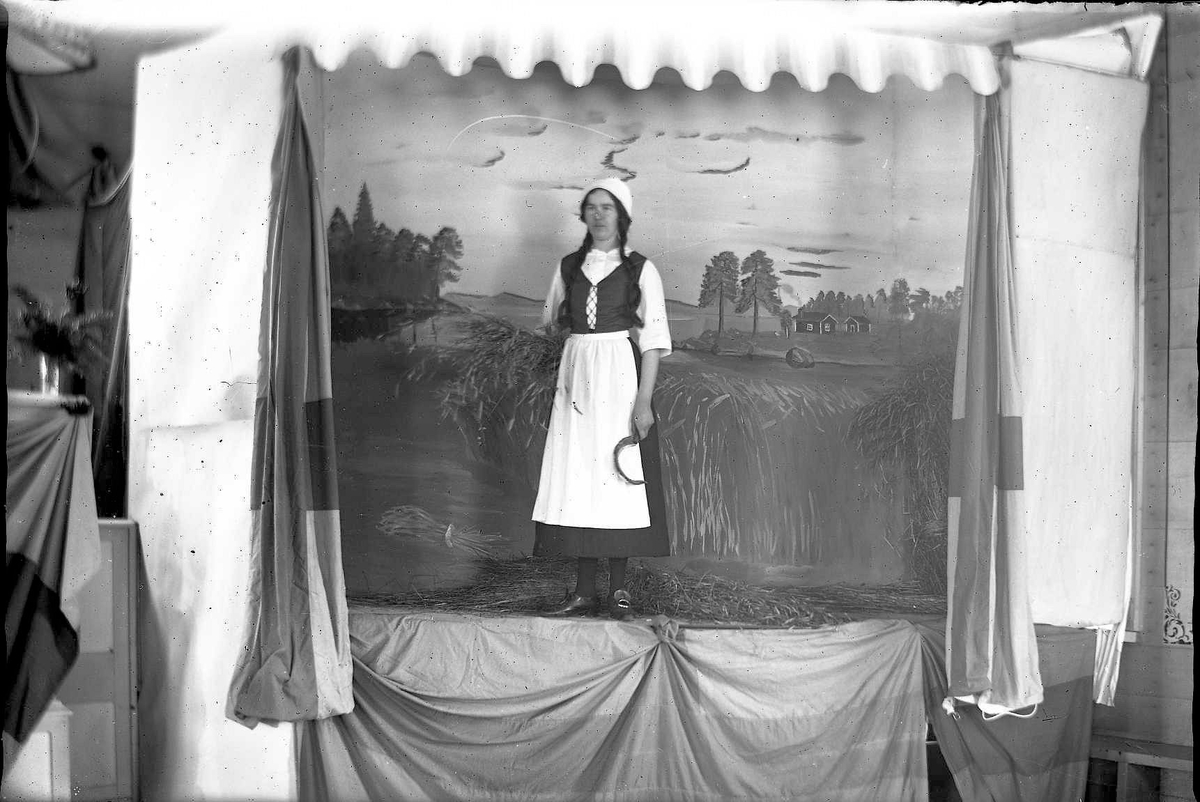 En kvinna stående på en scen iklädd kjol med tillhörande liv förkläde och huvudduk, I handen en skära och under armen det hon skördat. På scengolvet ligger mera hö (?) och i bakgrunden en fond med ett fält med gröda och två hus och några tallar om syns i fjärran.