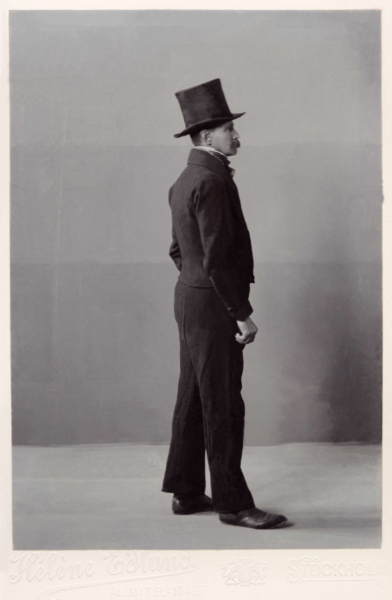 Man i folkdräkt med lång byxa, kort jacka och och hög hatt