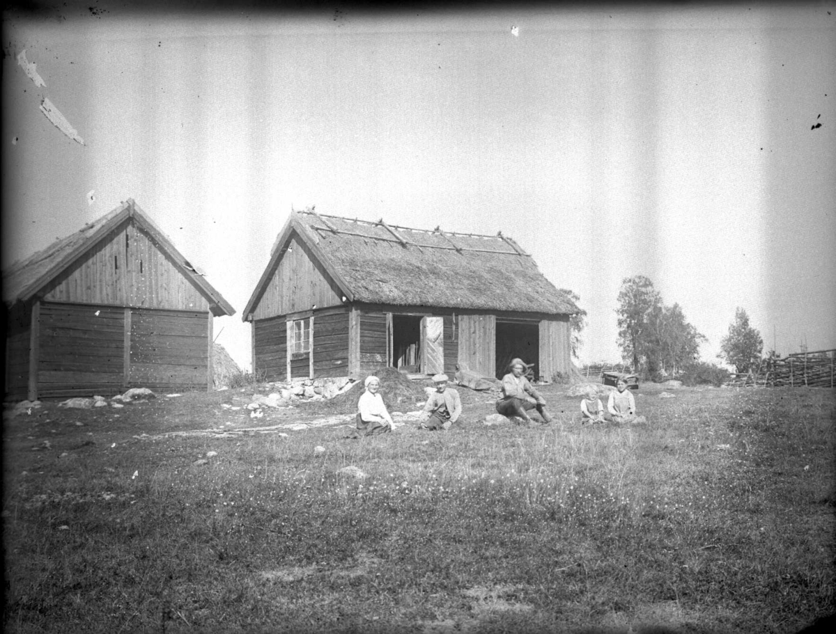 En familj sitter i gräset utanför två små ekonomibyggnader.