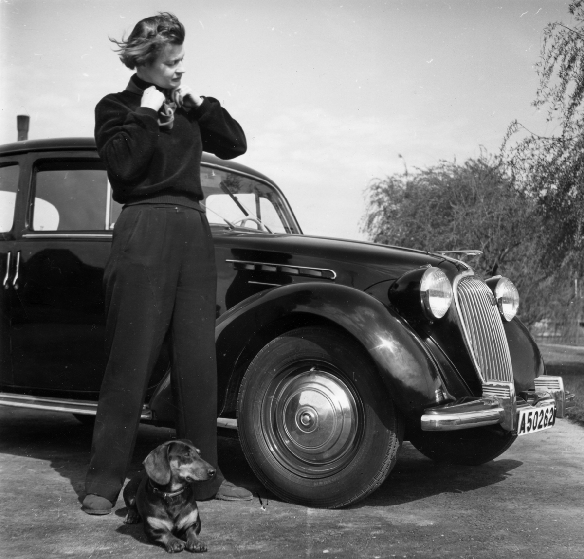 Fotografen Kerstin Bernhard står bredvid en bil tillsammans med sin tax