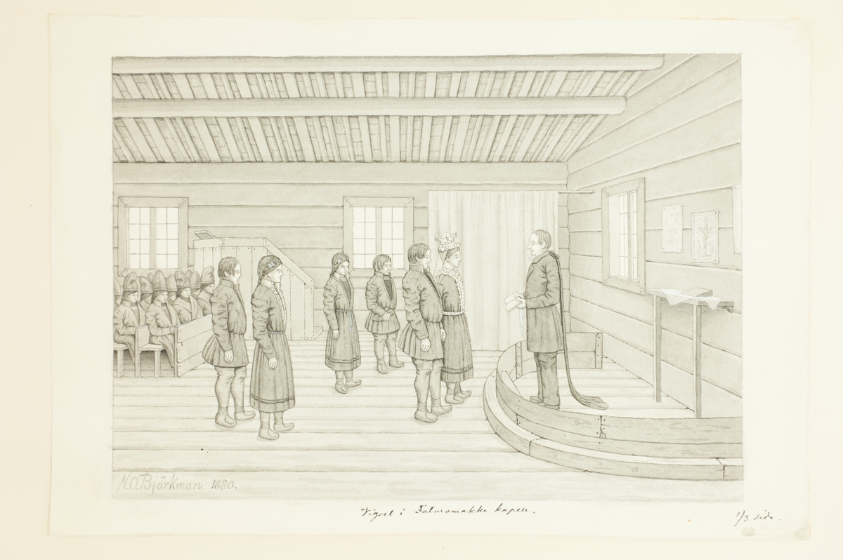 Tryck. Teckning av N. O. Björkman 1880. "Vigsel i Fatmomakke kapell." Samiskt brudpar och församling framför prästen i kapellet.
