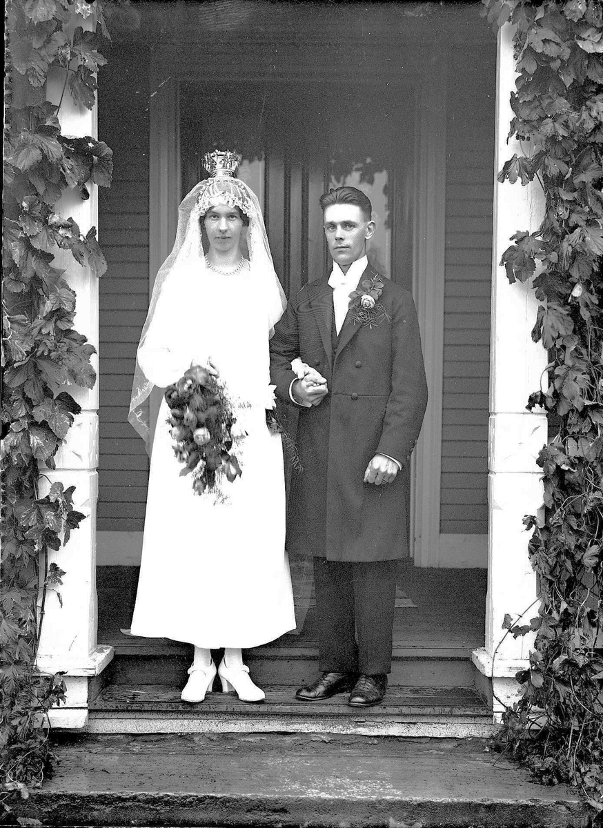 Helporträtt av ett bröllopspar i dörröppning. Lima, Dalarna