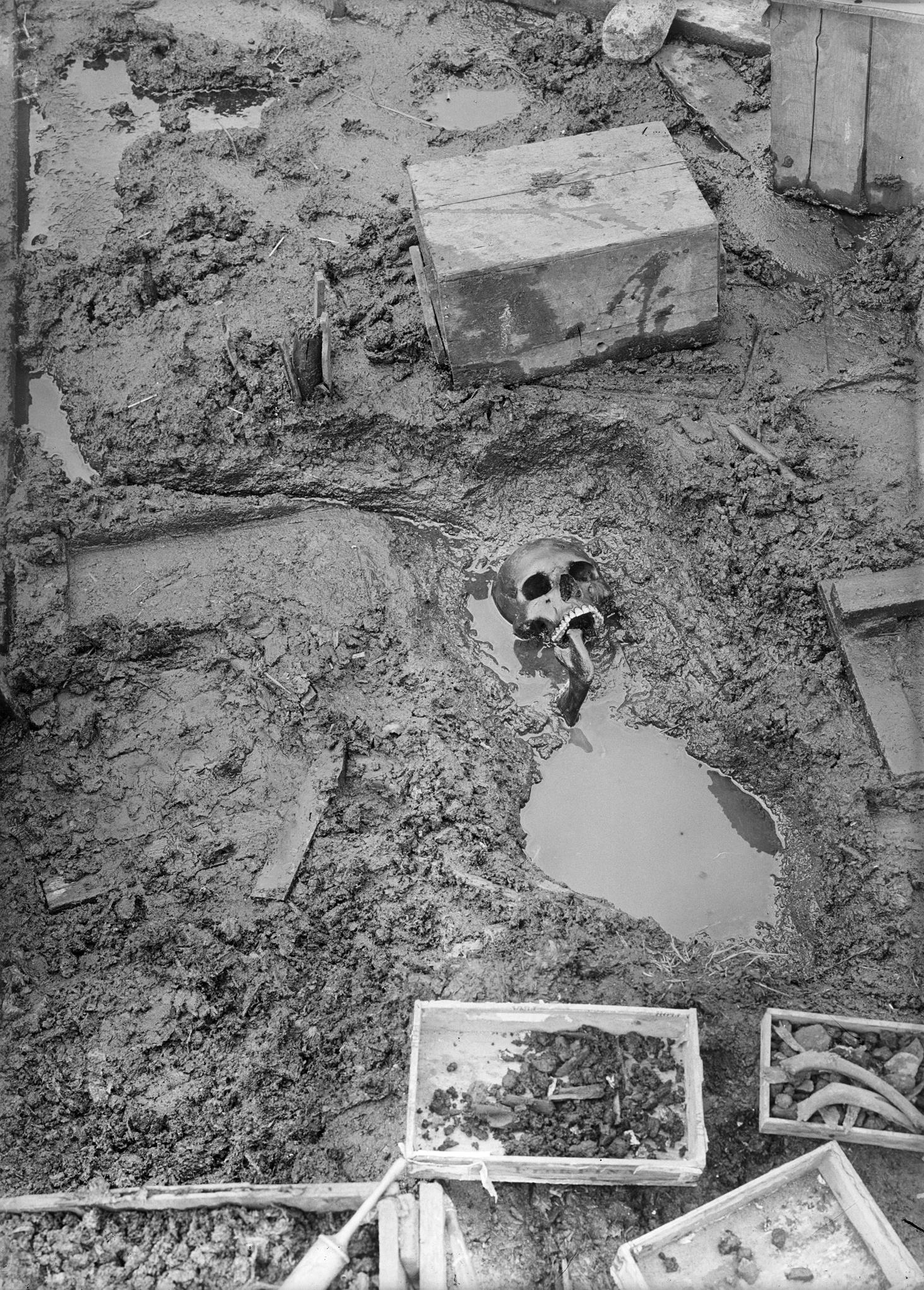RAÄ-nummer Västra Tollstad 22:1. Utgrävningen av stenåldersboplatsen. Skalperat kranium in situ.