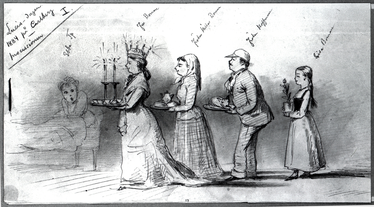 Luciadagen 1884 på Carlberg. Reprofotografi av blyertsteckning utförd av Henning Thulstrup (1836-1902). De avbildade personerna i det uppvaktande luciatåget, eller processionen, är fru Karin Boman, fröken Hildur Boman, fröken Hoffman och Lisa Boman. I sängen ligger Ebba Tp.