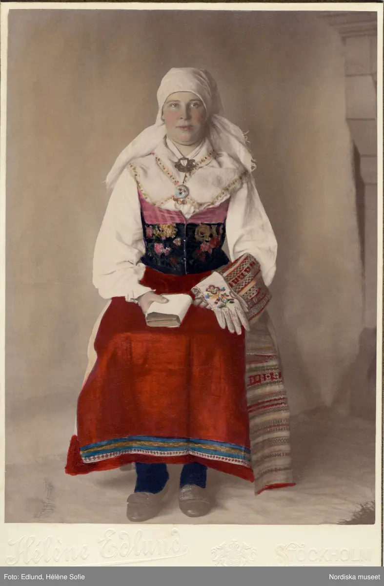 Kyrk och gillesdräkt för gift kvinna. Norra Öland. Handkolorerat fotografi.