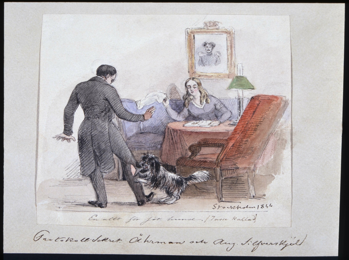 "Stockholm 1844. En allt för söt hund (Tasse kallad). Protokollsekret. Århman och Augusta Silfverskjöld". Akvarellerad tuschteckning av Fritz von Dardel.
