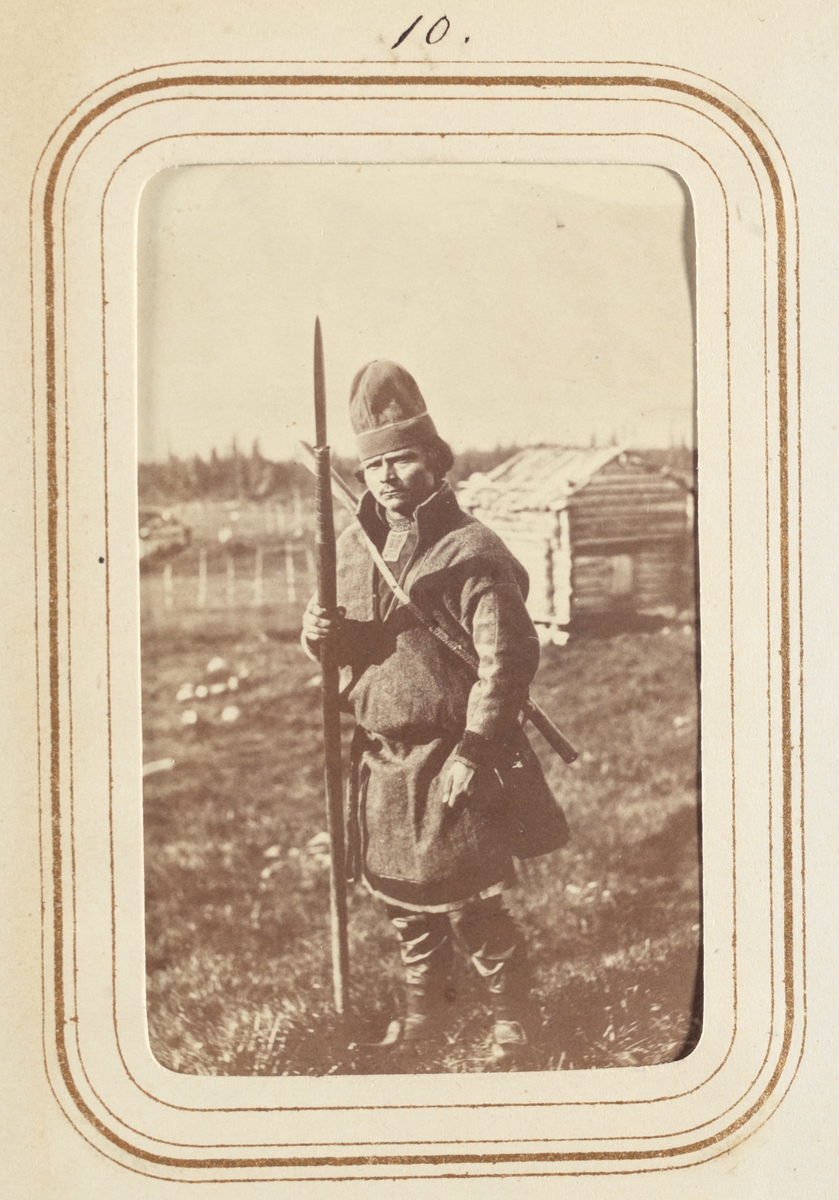 Samisk man med spjut. Per Olof Amundsson Länta, 27 år från Sirkas sameby i Jokkmokks socken.