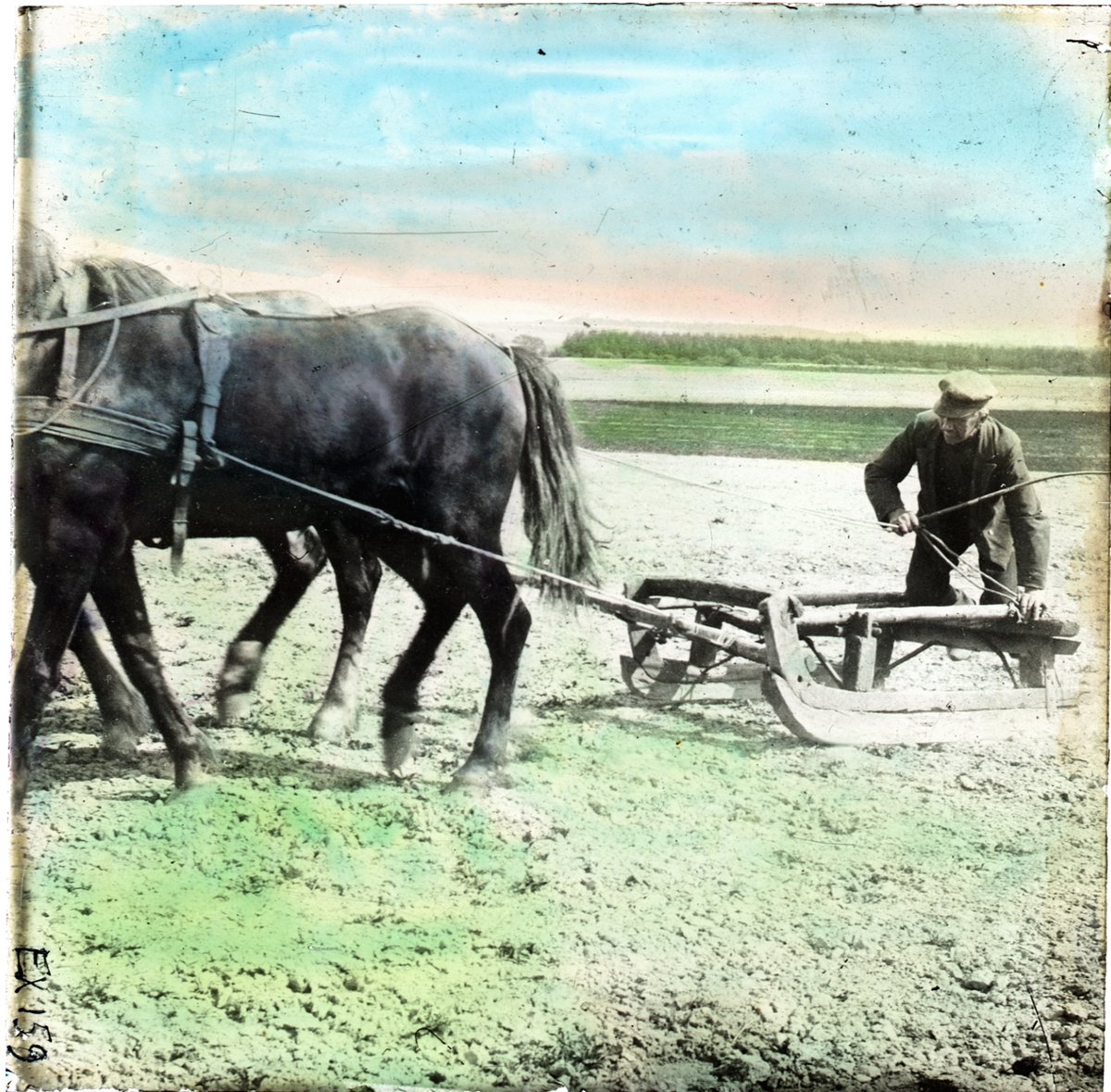 Man med två hästar som drar slädliknande redskap med dubbla medar. Handkolorerad skioptikonbild