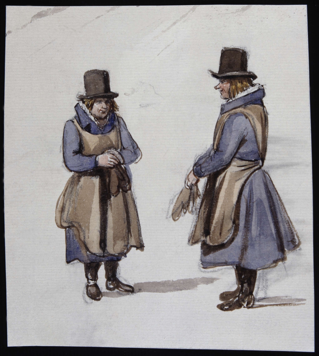 Två män i förkläde och hög hatt. Akvarell av Fritz von Dardel