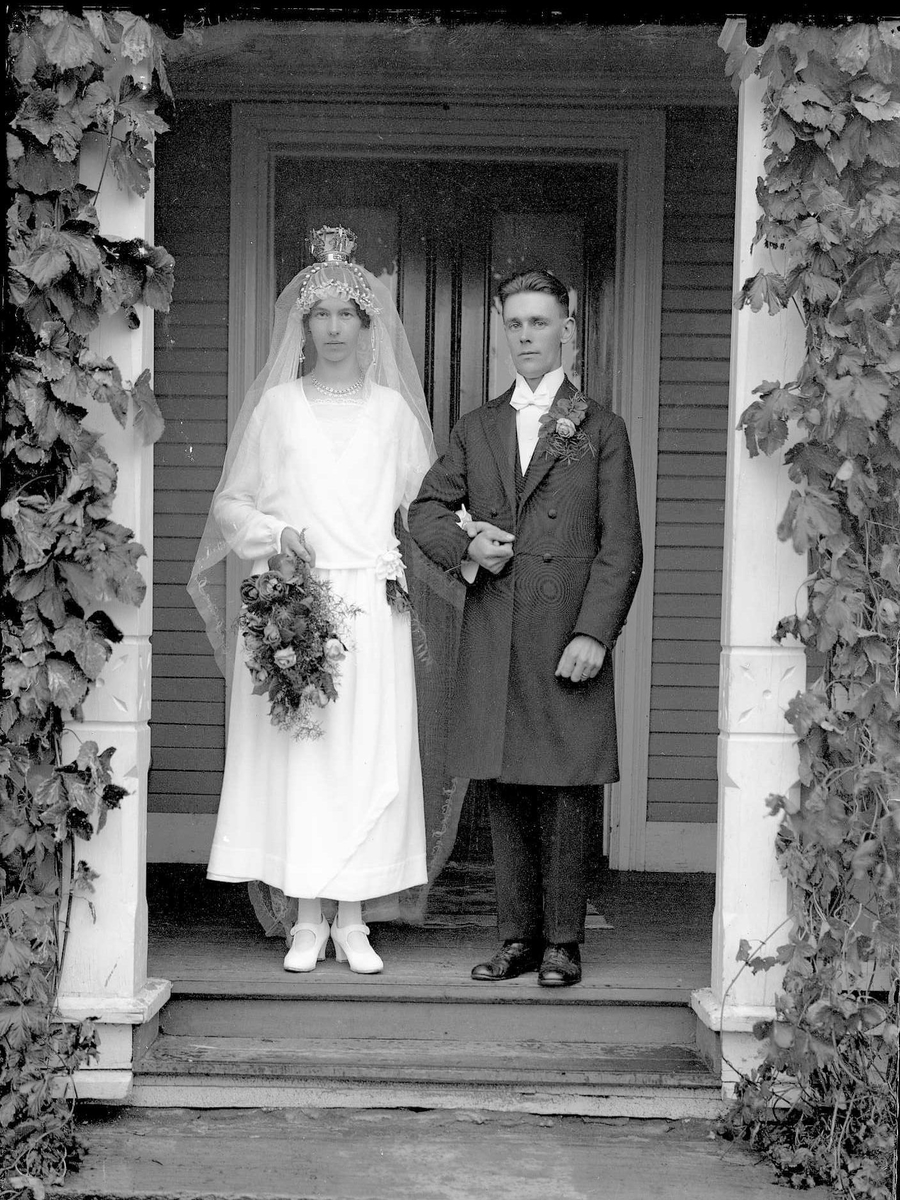 Helporträtt av ett bröllopspar i dörröppning. Lima, Dalarna