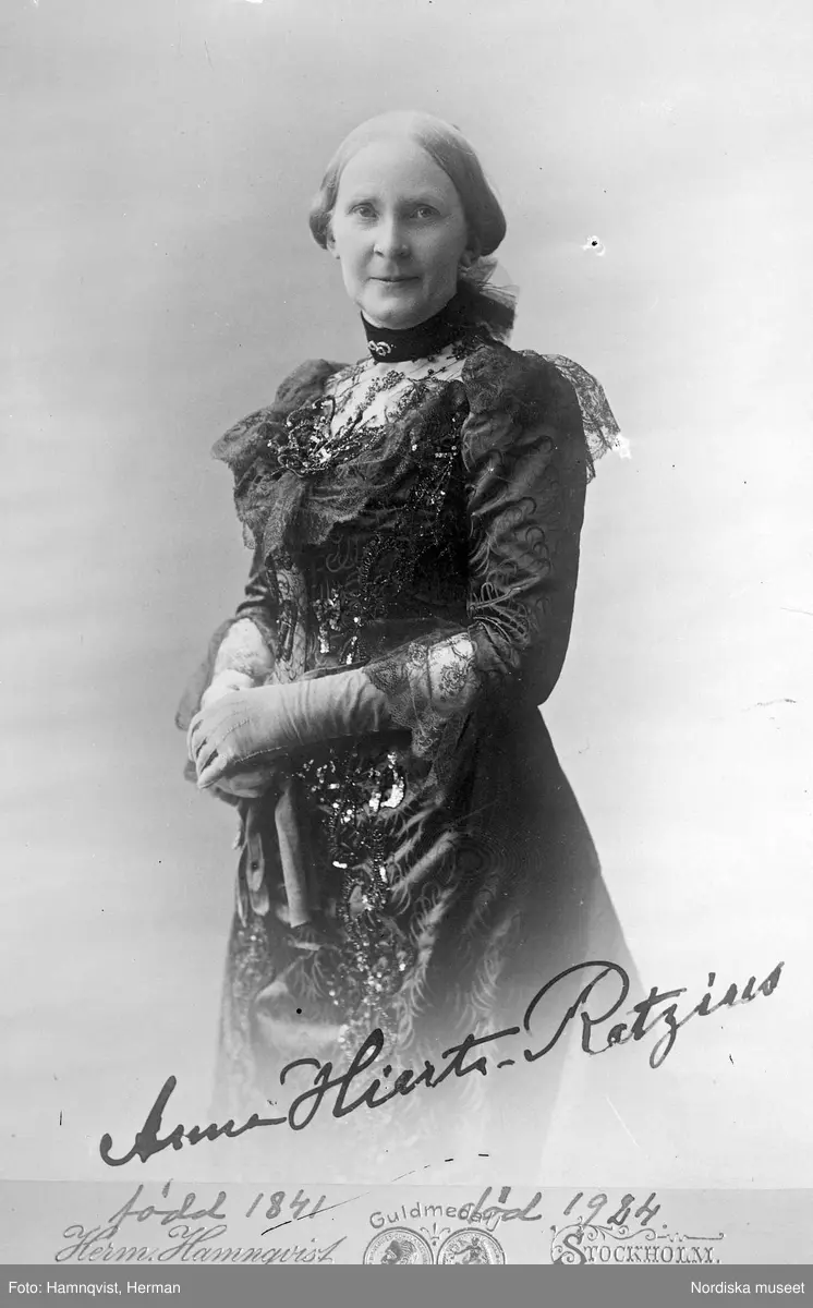 Kvinnligt porträtt. Enligt påskrift Anna Hierta-Retzius, grundare av Stockholms arbetsstugor. Arbetsstugan bildades i januari 1887.