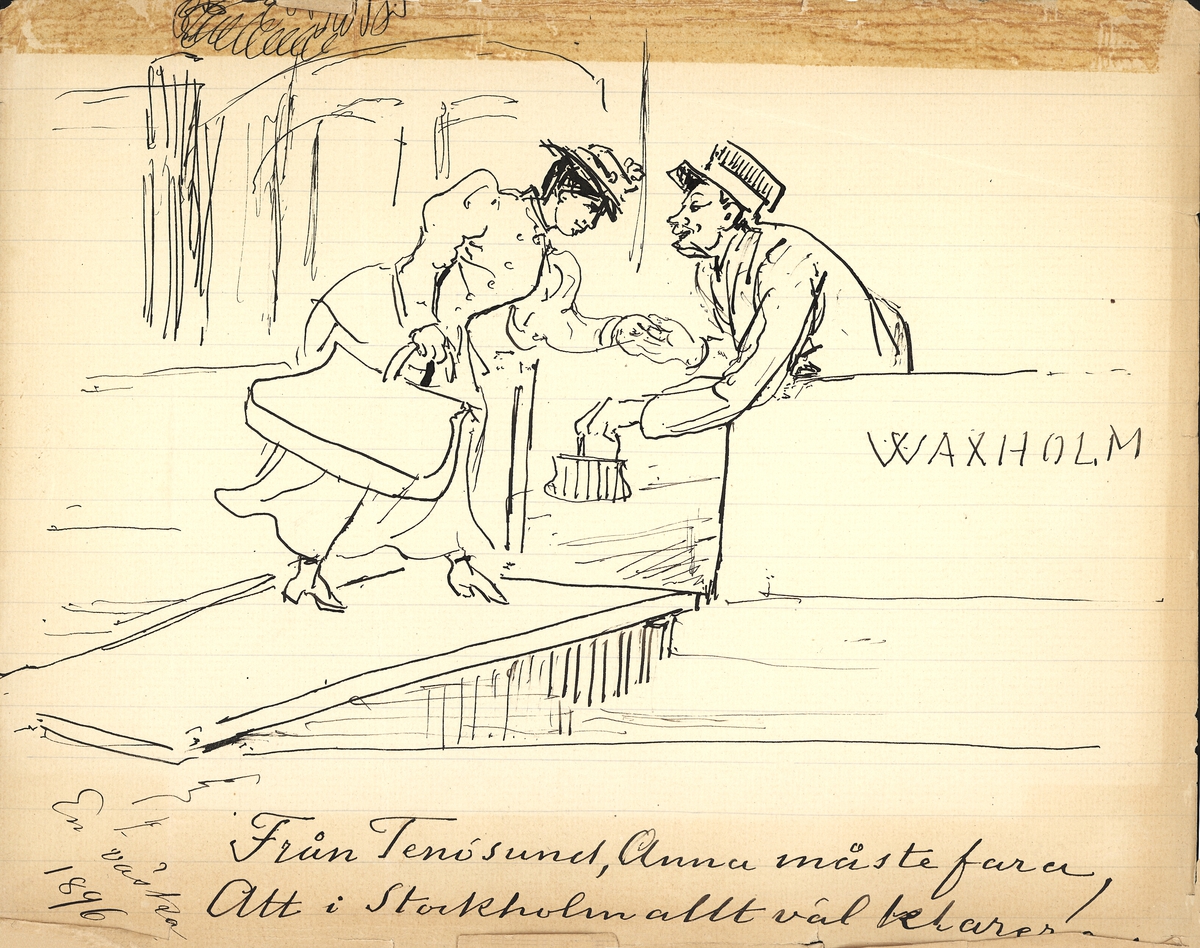 En kvinna stiger ombord på en Waxholmsbåt. "Från Tenösund, Anna måste fara, Att i Stockholm allt väl klar"...[svårläst].Teckning av Fritz von Dardel.