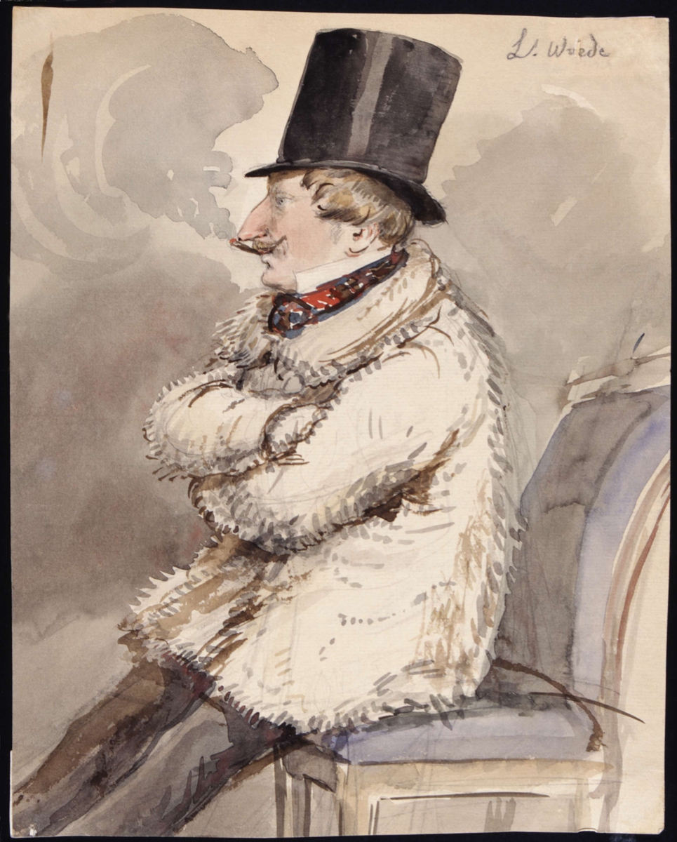 Man i pälsjacka och hög hatt sitter ytterst på en stol "L. Wiede". Akvarell av Fritz von Dardel.