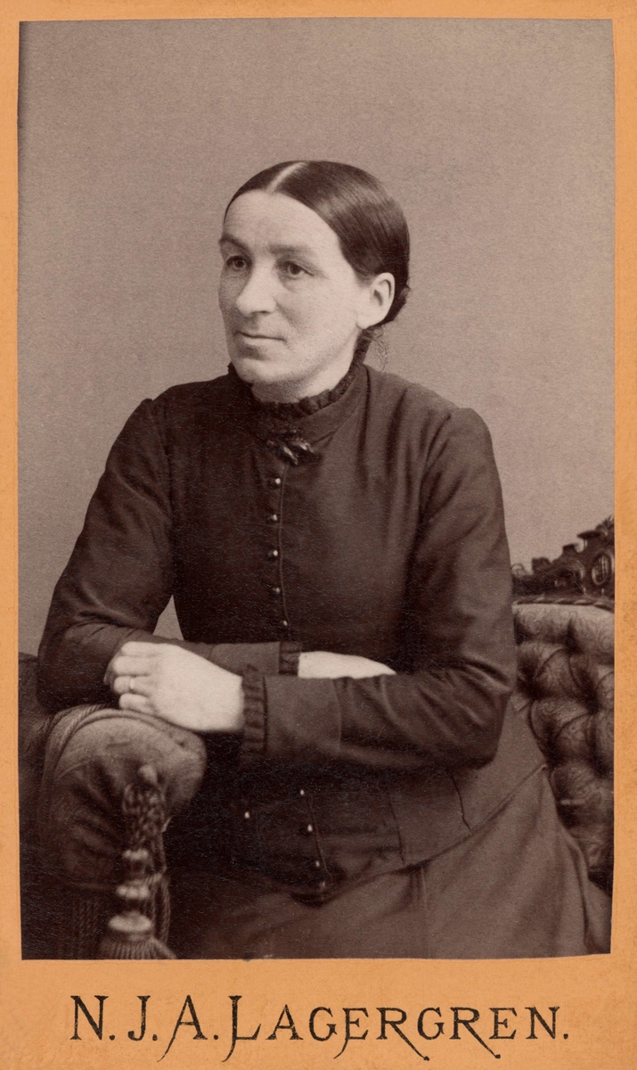 Ateljéporträtt. Kvinnoporträtt i halvfigur. Kvinnan är iklädd mörk klänning med tillhörande jacka