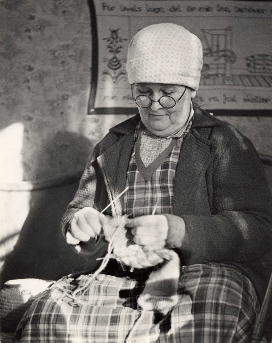 Äldre kvinna i vit mössa och runda glasögon sitter och stickar. I bakgrunden en broderad bonad på väggen.