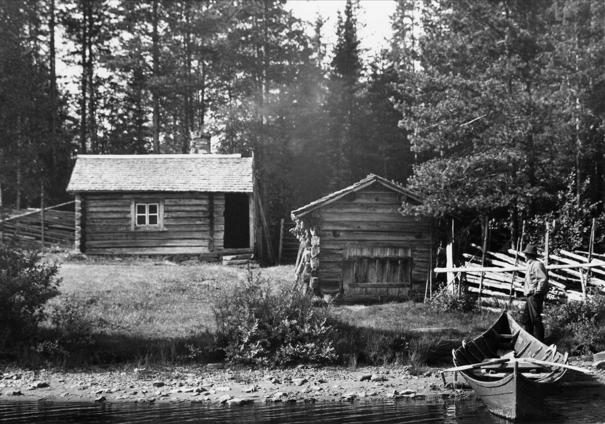 Gånors - Lars Johansson vid sin fiskestuga vid Hässjön. Gånors - Lars kallades Nesse