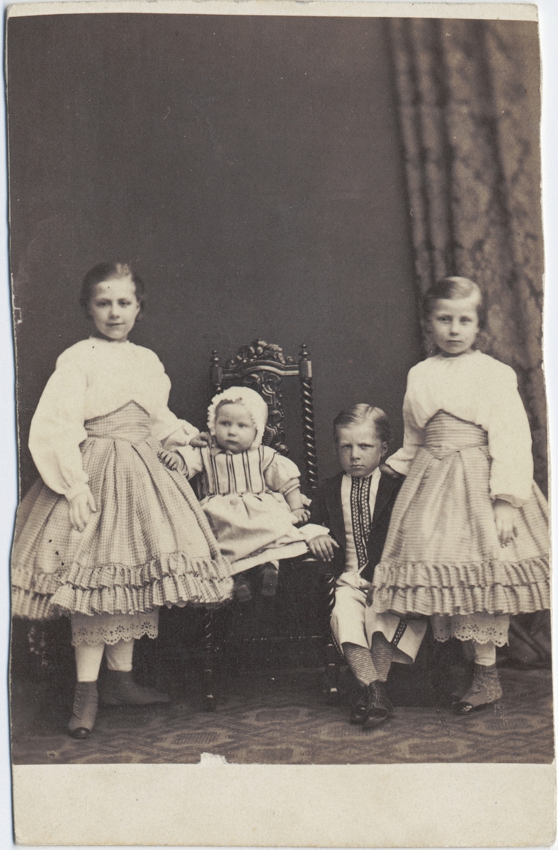 Kabinettkort. Porträtt av de fyra barnen Falkenius 1863. Två flickor klädda i volangkjol och blus står på var sida om en liten flicka sittande i en stol och en något större pojke som sitter bredvid henne.