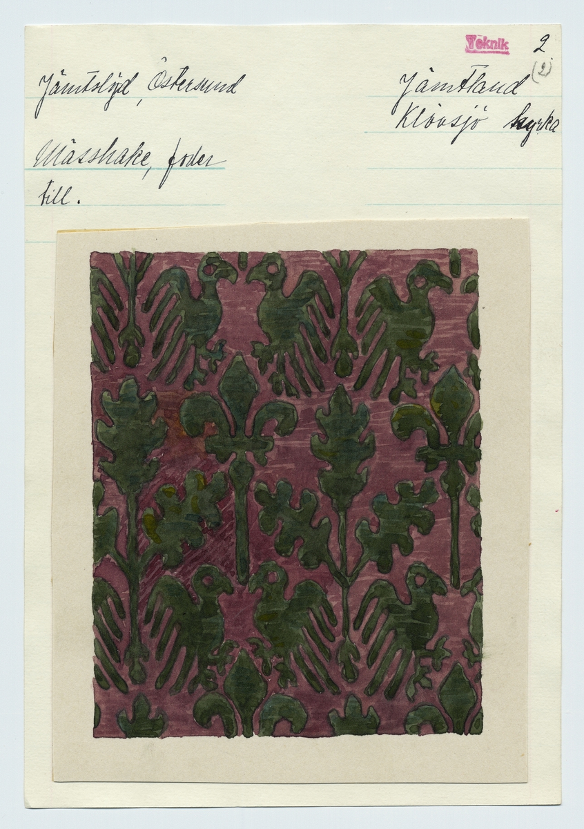 Katalogiseringskort, så kallad kataloglapp, från Nordiska museet. Sidenfoder till mässhake från Jämtland. Akvarell av Emelie von Walterstorff.
