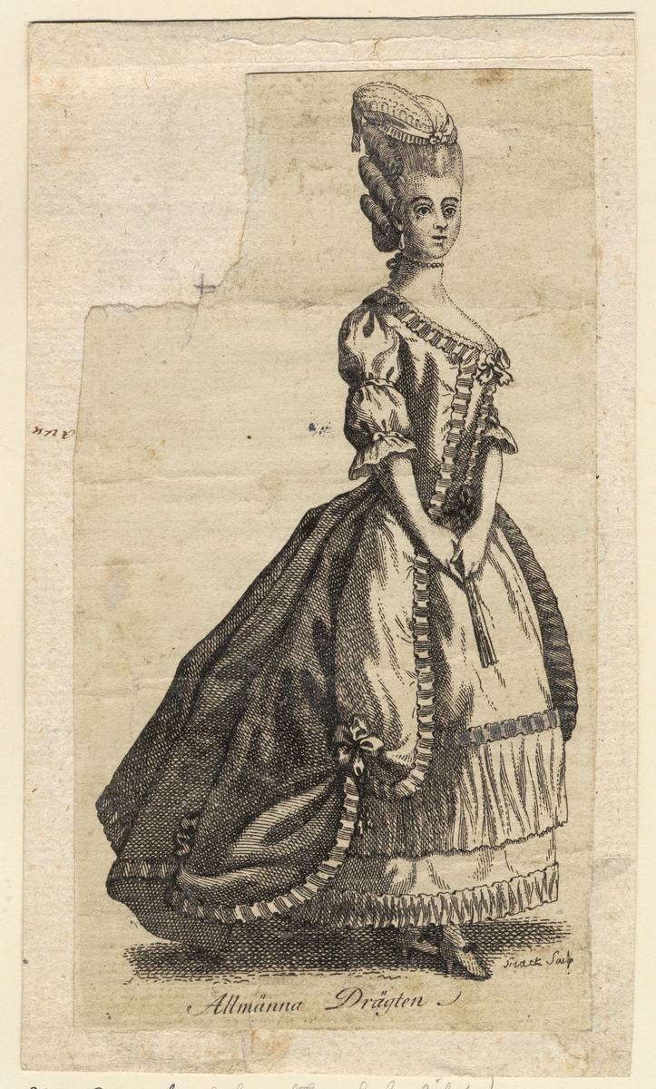 Gustaf III:s nationella dräkt. "Allmänna drägten." Dam i svenska dräkten. Gravyr av Johan Snack (1756-1790), trol. ca 1780.