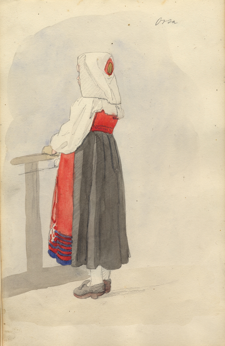 Akvarell. "Orsa " Kvinna i dräkt, sedd från sidan snett bakifrån, stående i helfigur . Ur Skissbok av A. J.G. Virgin